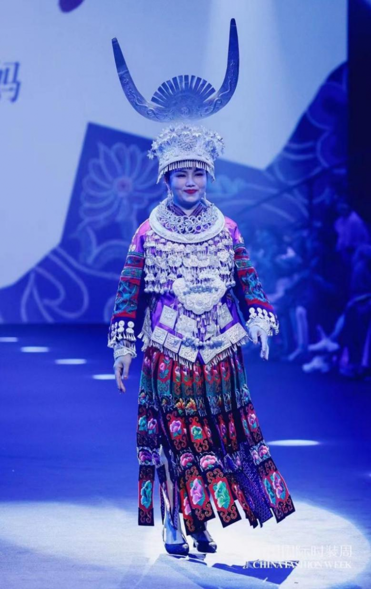 圖:燕之屋“天才媽媽”貴州苗繡夢想工坊主理人劉英登上中國國際時裝周走秀舞臺