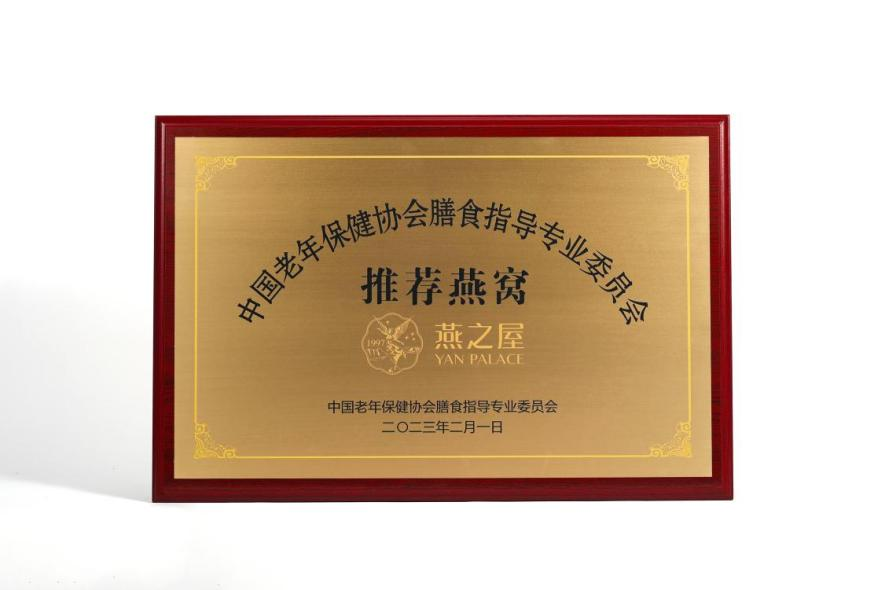 圖:燕之屋榮獲中國老年保健協(xié)會膳食指導專業(yè)委員會推薦燕窩榮譽牌匾、