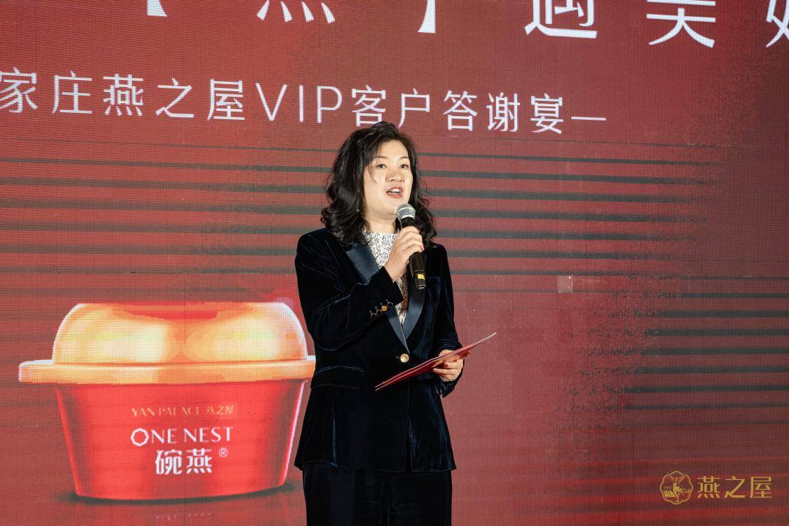 在熱烈的掌聲中,燕之屋石家莊合作商、河北法桐商貿(mào)有限公司總經(jīng)理趙寧上臺(tái)致辭,她說(shuō)道:“在這個(gè)特殊的場(chǎng)合,我想表達(dá)我們對(duì)每一位貴賓的深深感激。正是因?yàn)橛辛四闹С?,才有了今年燕之屋在香港的上市(股票代碼:01497.HK)。今年是燕之屋企業(yè)成立的26周年,26個(gè)寒暑走過(guò),我們初心不改,終于讓燕之屋成為了家喻戶(hù)曉的高端燕窩品牌,用品質(zhì)和服務(wù)征服了數(shù)以萬(wàn)計(jì)的客戶(hù)。”她與在座貴賓共同舉杯敬酒,向各位賓朋致以由衷謝意。