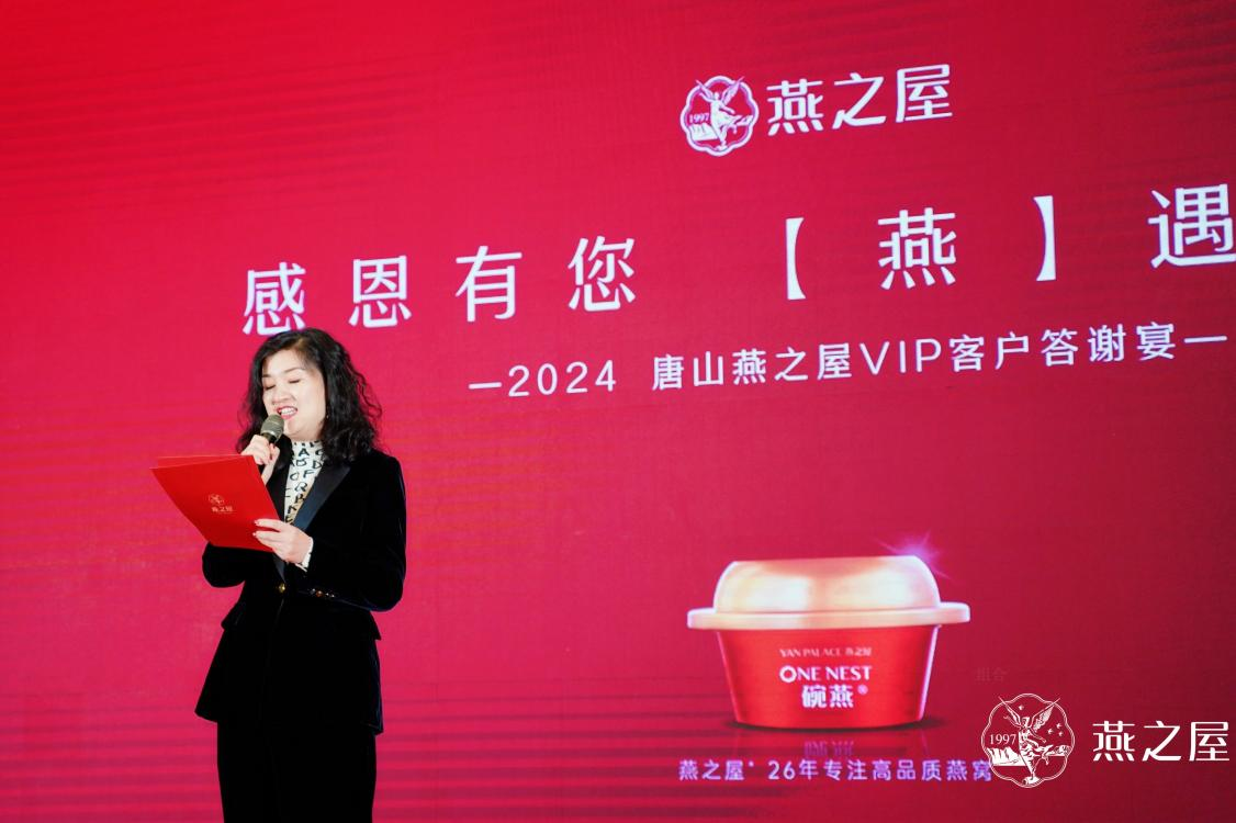 燕之屋* 26年專注高品質(zhì)燕窩(*燕之屋指燕之屋企業(yè)),不僅以匠心工藝和創(chuàng)新科技傳承東方滋補(bǔ)文化,更是以優(yōu)質(zhì)產(chǎn)品和精心服務(wù)滋養(yǎng)每一位消費(fèi)者。晚宴開場(chǎng)前,燕之屋輪番播放企業(yè)宣傳片,分享企業(yè)的發(fā)展與榮光,邀大家共同領(lǐng)略品牌文化。傍晚六點(diǎn)零六分,答謝宴在燕之屋唐山市場(chǎng)客服部的舞蹈串燒中拉開帷幕。燕之屋唐山合作商、河北法桐商貿(mào)有限公司總經(jīng)理趙寧上臺(tái)致辭,她說道:“感謝大家在百忙之中來參加今天的VIP客戶答謝宴,使得這個(gè)美好的時(shí)刻更加璀璨奪目。在這個(gè)特殊的場(chǎng)合,我想表達(dá)我們對(duì)每一位貴賓的深深感激。您們的支持和信任是我們前行的動(dòng)力源泉,也正是因?yàn)槟鷤兊闹С?,才有了今年燕之屋在港交所的成功上市(股票代碼:01497.HK)。愿我們今天共享美好時(shí)光,祝各位身體健康,事業(yè)蒸蒸日上!”
