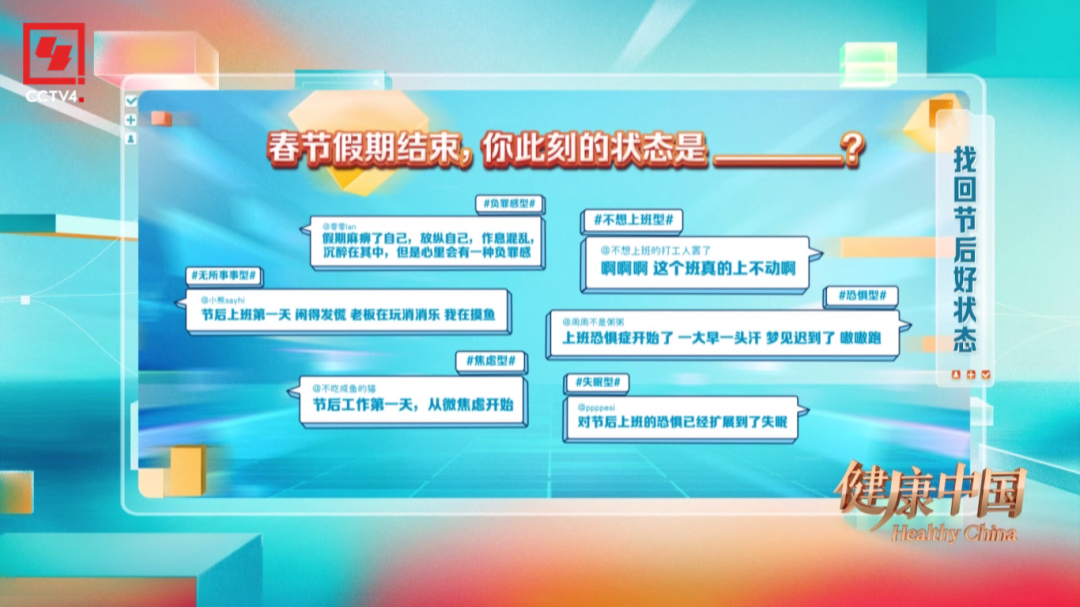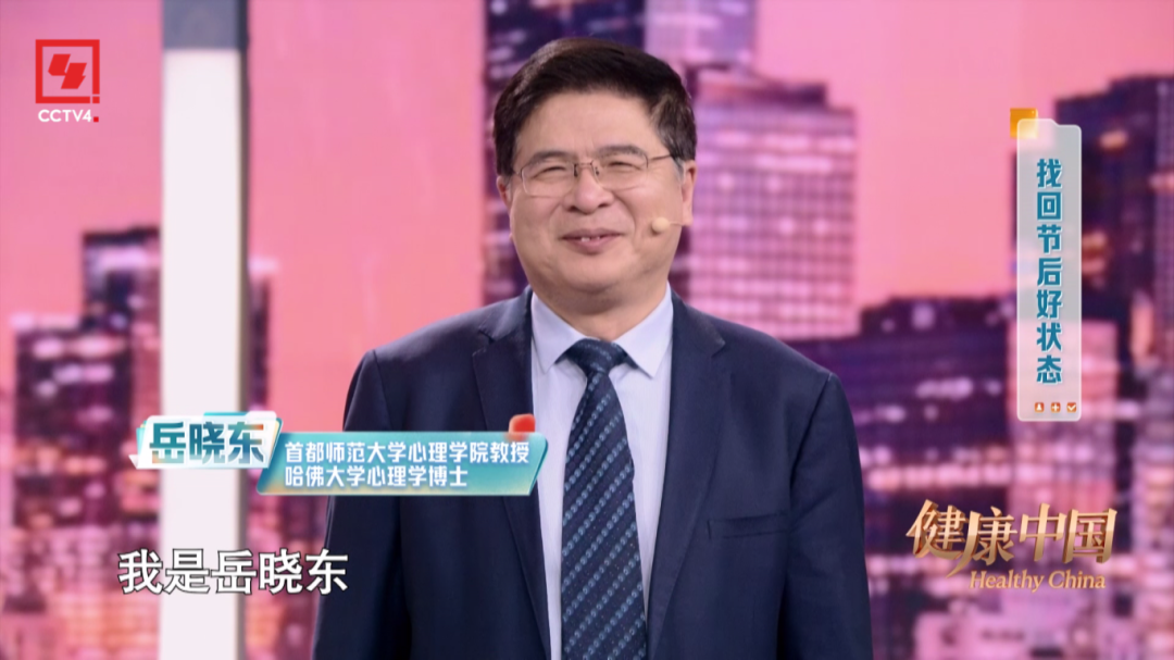 本期,由燕之屋獨家冠名的CCTV-4大型健康類欄目《健康中國》特邀首都師范大學心理學院教授、哈佛大學心理學博士岳曉東和清華大學社會科學學院院長彭凱平教授,以及北京大學第三醫(yī)院運動醫(yī)學科的苗欣博士,與您共同探討如何找回節(jié)后好狀態(tài)。