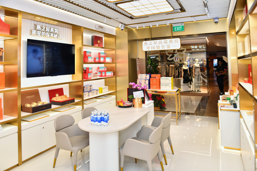 燕之屋新加坡專賣店落戶烏節(jié)路義安城,這里是新加坡知名商業(yè)購物中心,匯聚全球高端品牌與潮流風尚,深受本地居民以及游客的喜愛。選址于這一商業(yè)地標,不僅依托其龐大客流量與國際化消費場景,更通過品牌與高端商業(yè)生態(tài)的深度綁定,進一步鞏固其燕窩行業(yè)“領頭燕”的形象,彰顯了燕之屋進軍高端市場的決心。作為燕之屋新加坡首店,燕之屋新加坡專賣店空間設計以“燕屋”為靈感載體,將金絲燕棲居的自然智慧與燕之屋對品質的極致追求充分融合。門頭采用中英文雙語標識,既展現(xiàn)品牌植根中華養(yǎng)生文化的底蘊,亦傳遞其擁抱全球化市場的開放姿態(tài)。