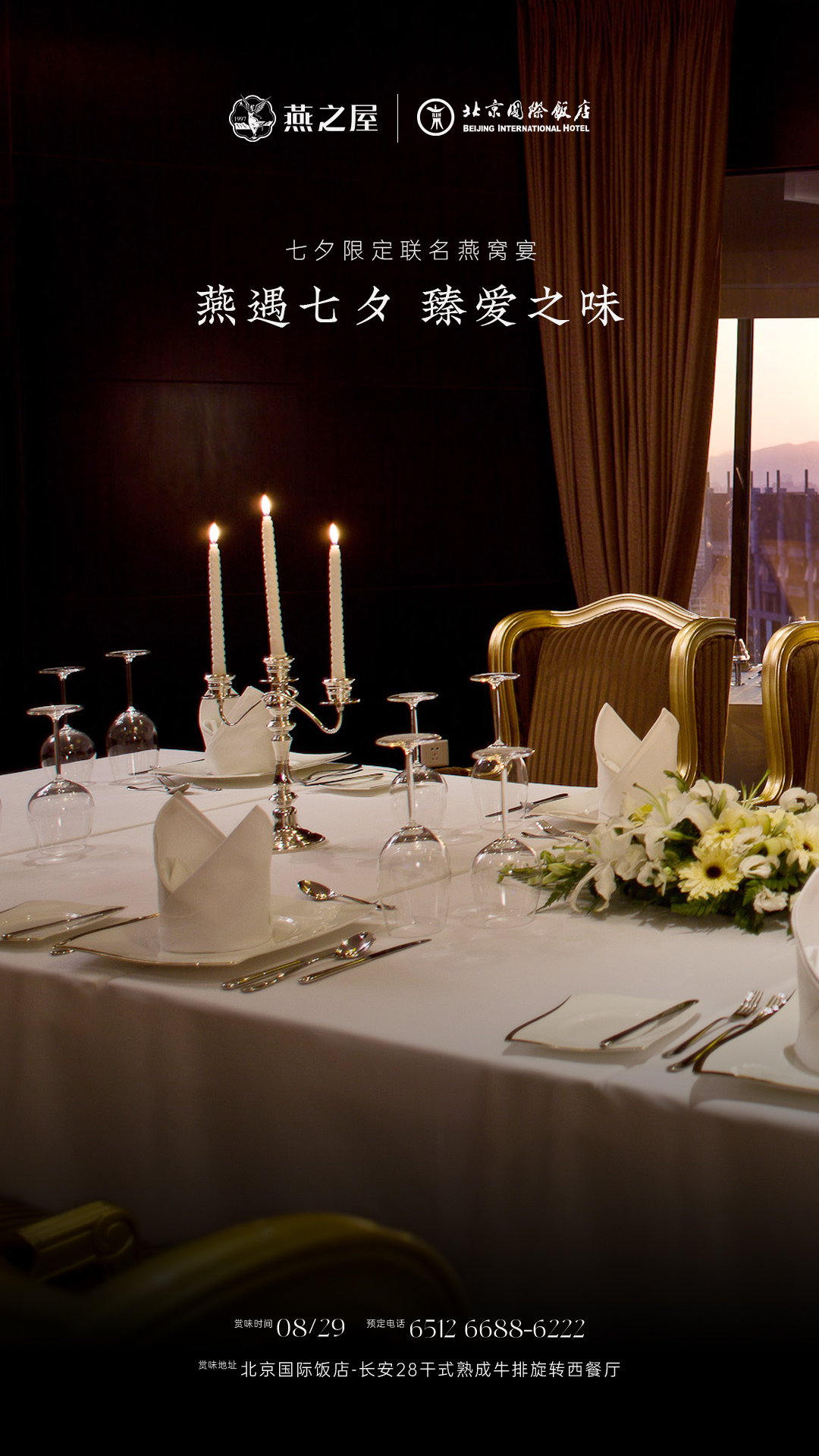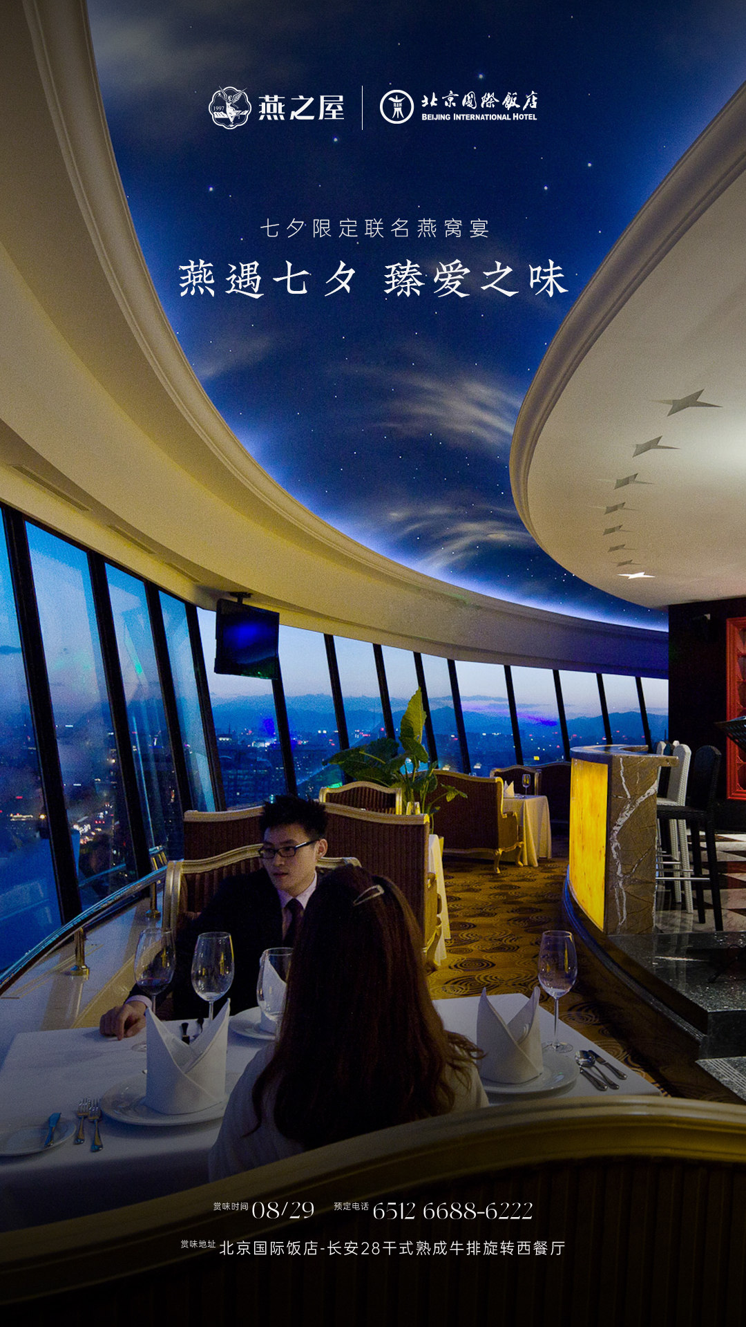 北京國(guó)際飯店長(zhǎng)安28餐廳作為北京市中心高空360度環(huán)瞰京城盛景的旋轉(zhuǎn)餐廳,以其獨(dú)特的奢華與雅致并存的裝修風(fēng)格,成為京城高端餐飲場(chǎng)所。604㎡餐廳空間、100個(gè)精致餐位,3間多功能廳房,配合專業(yè)的服務(wù)團(tuán)隊(duì),為每位賓客提供尊貴的用餐體驗(yàn)。燕之屋27年專注高品質(zhì)燕窩,始終堅(jiān)持“源于天然,美與健康”的理念,以創(chuàng)新科研賦能上乘品質(zhì),連續(xù)九年高端燕窩全國(guó)銷售第一①。此次合作是云端視野與輕奢品味的雙重尊享,正如每一對(duì)相約七夕的甜蜜愛(ài)侶。