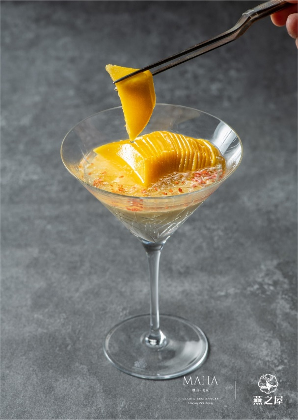 秋葵黃魚燕窩羹,燕窩經(jīng)凈水浸沐6小時(shí),換水滌塵,撕作雪絲隔水輕燉;黃魚淋開水封鮮,煎至金黃生香,搗碎入滾水熬至濃白;秋葵片灼水,如玉簪點(diǎn)入羹中。這一盅融深海之鮮、燕窩之潤、青蔬之清——沿襲古法,讓食養(yǎng)同源的美味在舌尖化開。發(fā)酵酸湯龍蝦趴燕窩汁,龍蝦肉冷腌15分鐘,裹上特調(diào)漿粉炸出金黃蜂巢脆衣,咬下時(shí)“咔嚓”聲如秋葉碎響。番茄經(jīng)自然發(fā)酵成琥珀酸湯,澆淋現(xiàn)燉燕窩汁——酸鮮激蕩中,燕窩柔滑如綢緞?chuàng)徇^舌尖,是主廚獻(xiàn)給味覺的冒險(xiǎn)詩篇。芒果酒釀桂花蜜蛋糕配新鮮芒果及燕窩:“燕窩需隔水輕蒸,裹住桂花蜜的魂。”主廚將酒釀熬作凝脂奶凍,托起卡曼橘芒果慕斯的俏皮酸香。頂層燕窩如琉璃凍雨,新鮮芒果是點(diǎn)睛明月。撒入桂花,取“蟾宮折桂”的好兆頭。當(dāng)瓷勺探底——酒釀的醇厚、慕斯的輕盈、燕窩的滑潤在口中共譜秋月的詩篇。