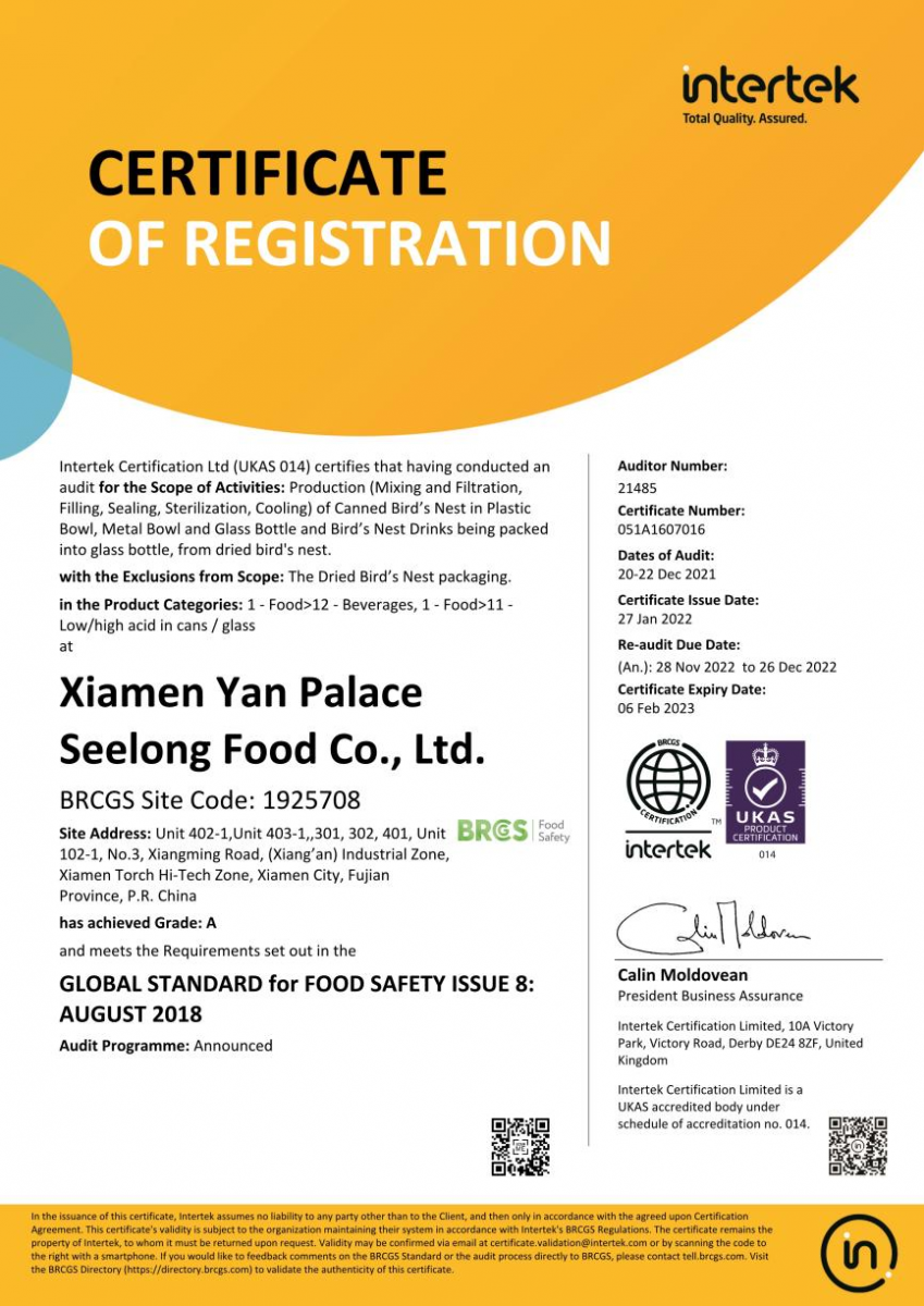 圖:燕之屋獲得“BRC食品安全全球標(biāo)準(zhǔn)認(rèn)證”