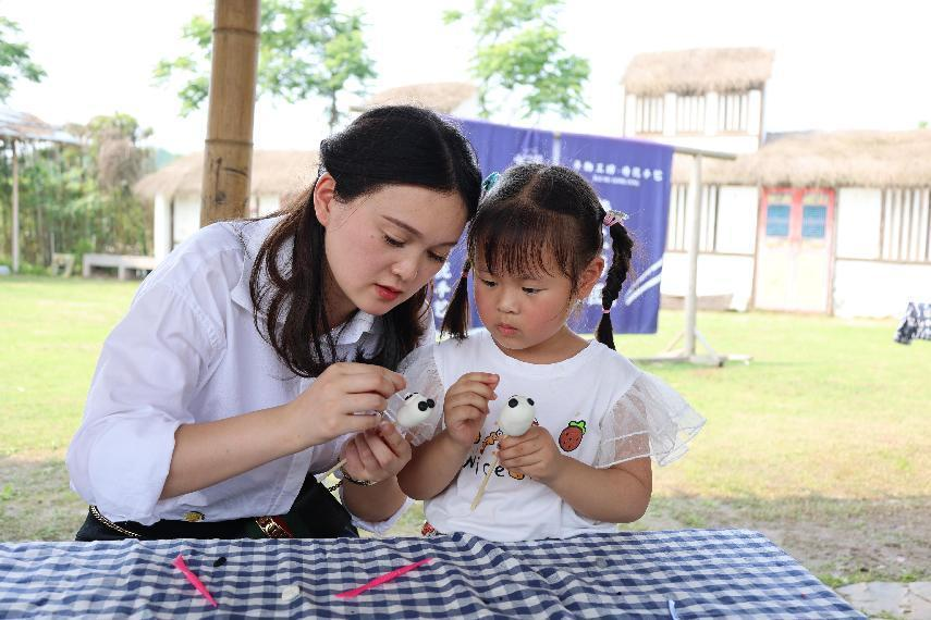 當(dāng)天,伴隨著一曲歡快的親子律動熱身操和一場有趣的蘿卜蹲游戲,活動正式拉開帷幕。置身于大自然的懷抱,大小朋友化身為小小農(nóng)場主,依次進行了養(yǎng)蠶抽蠶絲、蹚水抓魚、包餃子活動,以及非遺藍染手作和非遺面塑體驗。
