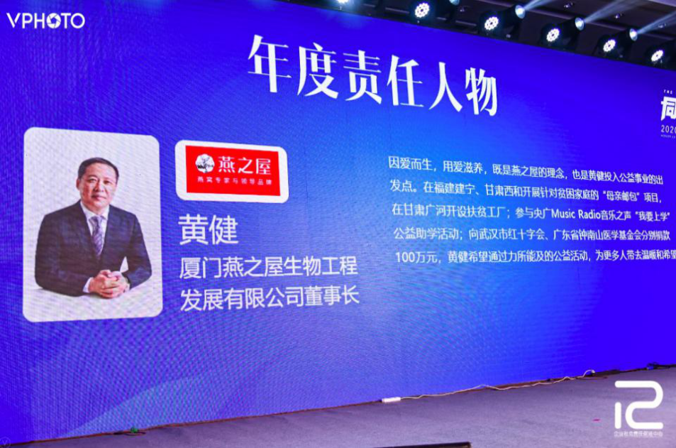 圖:燕之屋董事長、創(chuàng)始人黃健先生獲《新周刊》“2020年度責任人物”