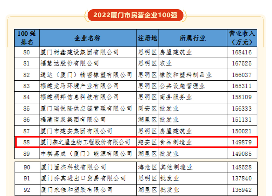 圖:燕之屋榮獲2022年廈門市民營企業(yè)100強(qiáng)