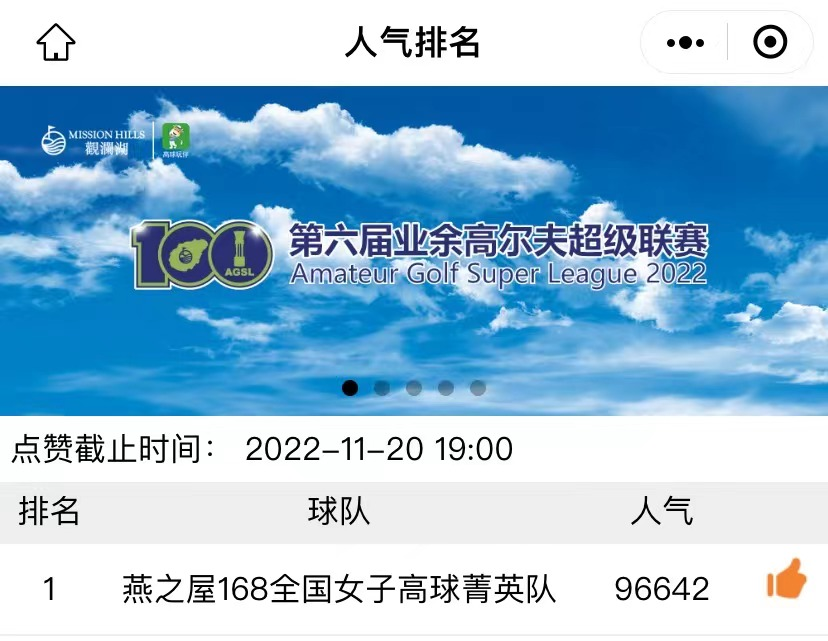 11月20日,2022第六屆業(yè)余高爾夫超級聯(lián)賽全國總決賽在??谟^瀾湖高爾夫球會圓滿收桿。經(jīng)過兩天激烈的角逐,燕之屋168全國女子高球菁英隊入圍前二十強,并榮獲網(wǎng)絡投票第一名。