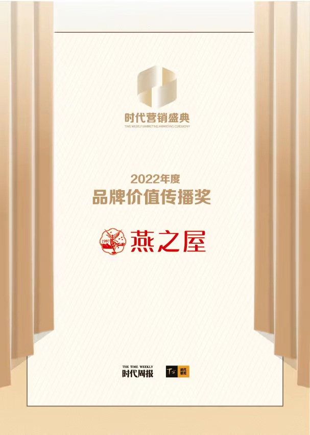 圖:燕之屋榮獲第十五屆時(shí)代營(yíng)銷(xiāo)盛典品牌價(jià)值傳播獎(jiǎng)
